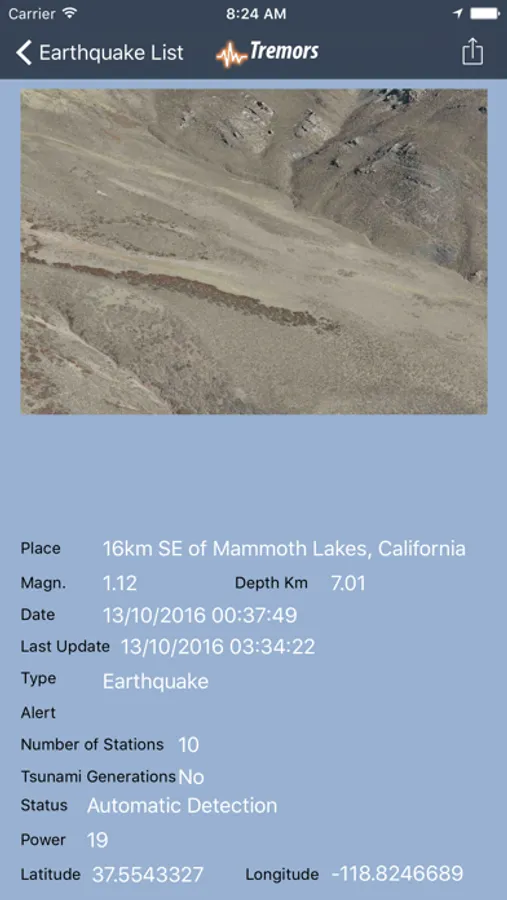 - "Detail List of Earthquakes" with all the geographical details and data of the earthquake, as well as an image in "Fly Over" of the place