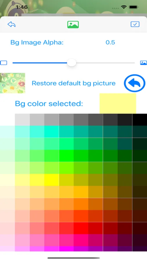 - You can change the background image and background color (Alpha value of the background image should be set smaller than 1 for the background color to be effective).