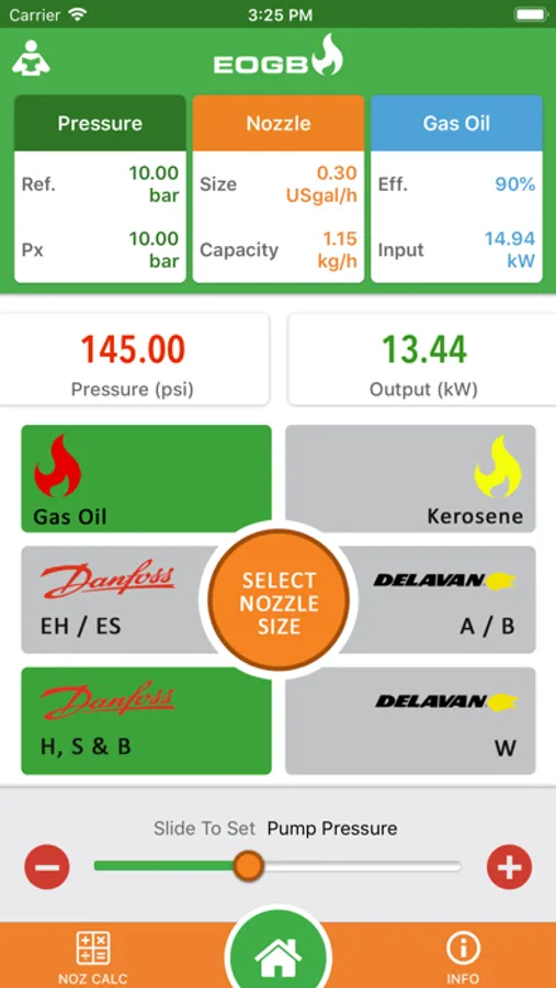 Easy to use, the calculator covers Kerosene (Class C2) and Gas Oil (Class D) fuels (to BS2869) and all Danfoss nozzle types, it is suitable for all makes of Pressure Jet Oil burners that use Danfoss Nozzles.