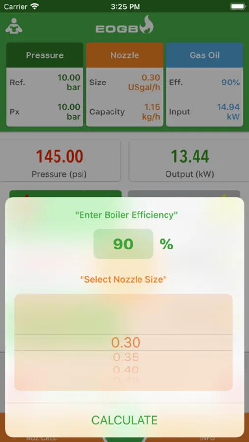 It will calculate burner and boiler outputs in kW based on pump pressure, nozzles size and boiler efficiency inputs.