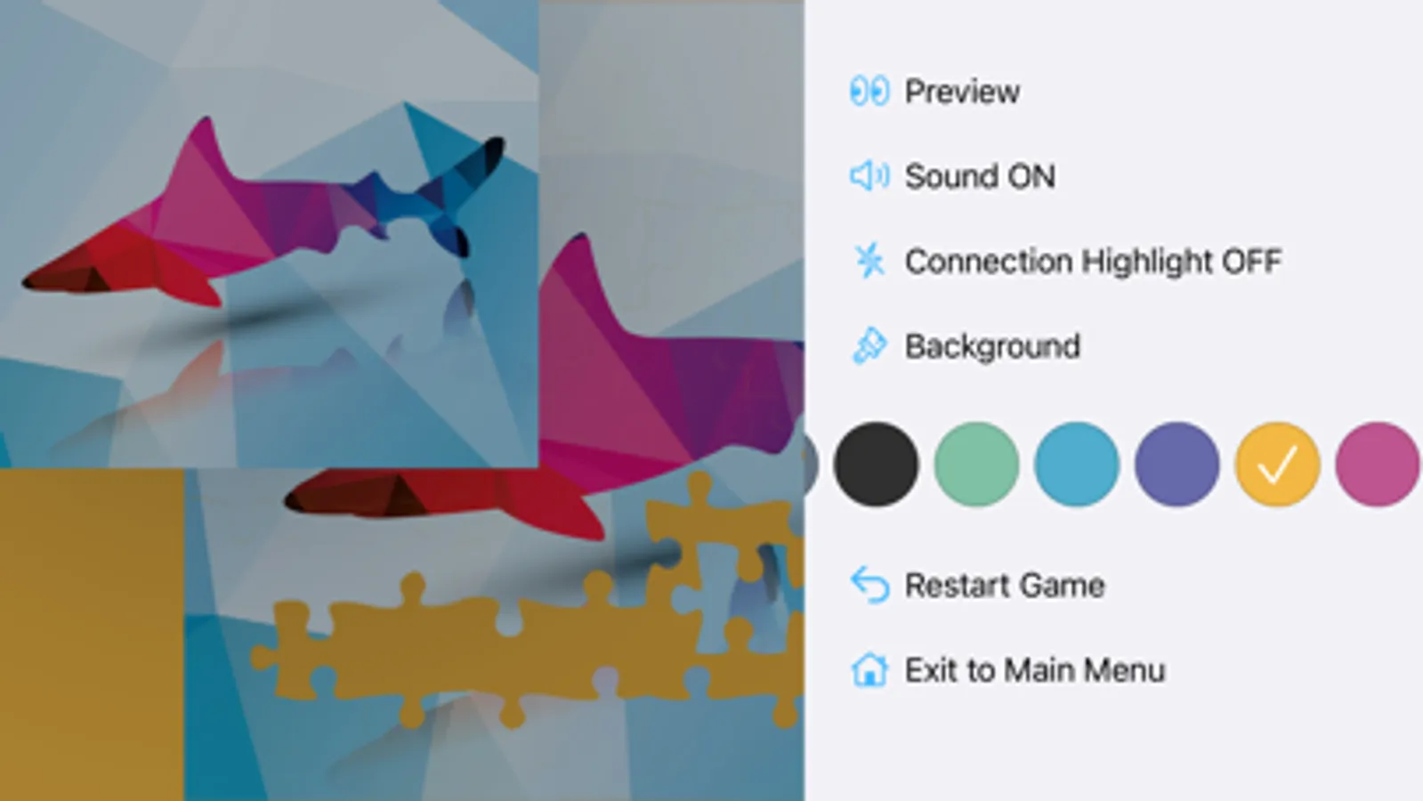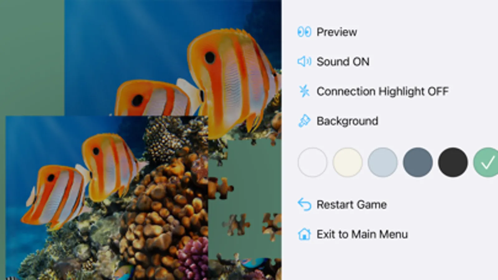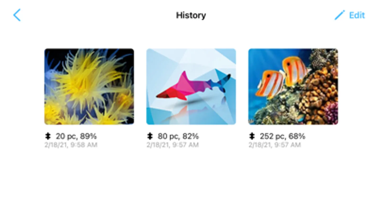 - 8 levels of complexity: from  20 pieces up to 1110 pieces, available for any puzzle;