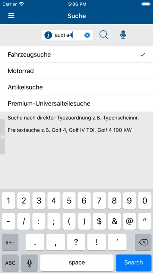 Mögliche Suchkriterien für eine schnelle Teileidentifkation sind eine beliebige Nummer, die Artikelnummer, eine OE-Nummer, die Gebrauchsnummer, die Vergleichsnummer oder Typenscheinnummer. Alternativ lassen sich über den Registerreiter "PKW" Fahrzeuge ohne Schlüsselnummer suchen.