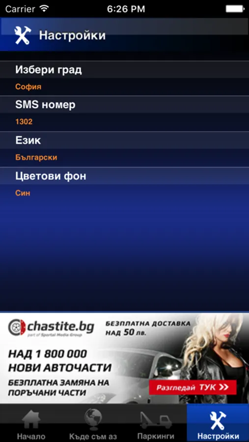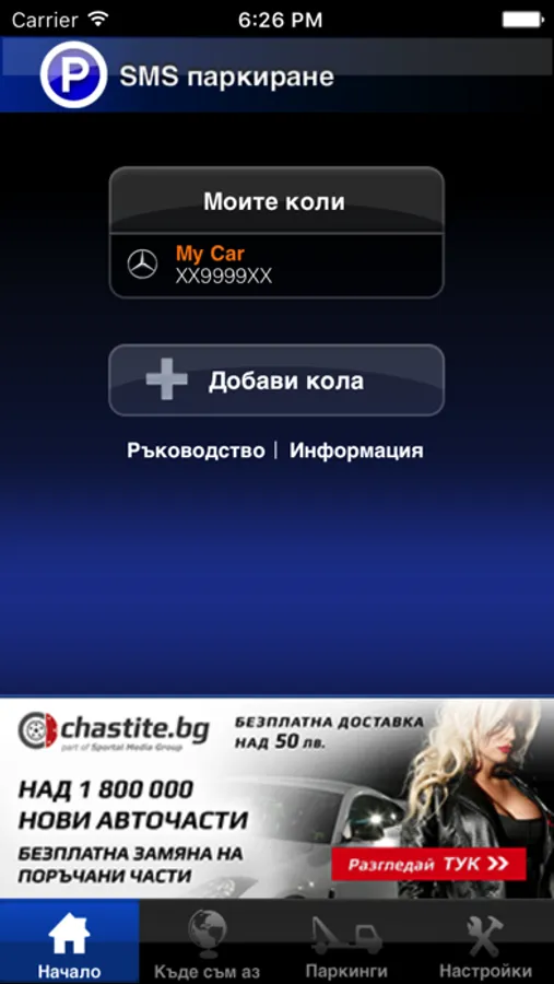 „SMS Паркинг“ е приложение, което Ви дава възможност да създадете профил на един или повече автомобили с техните регистрационни номера и да заплащате паркирането в “Синя Зона“ или "Зелена Зона" за избран автомобил.
