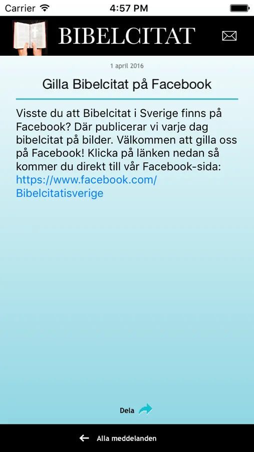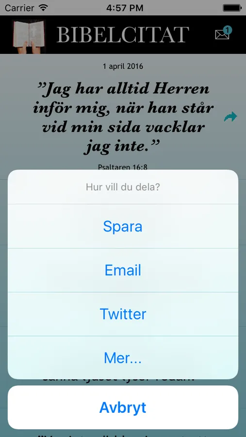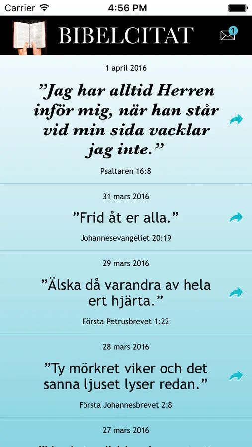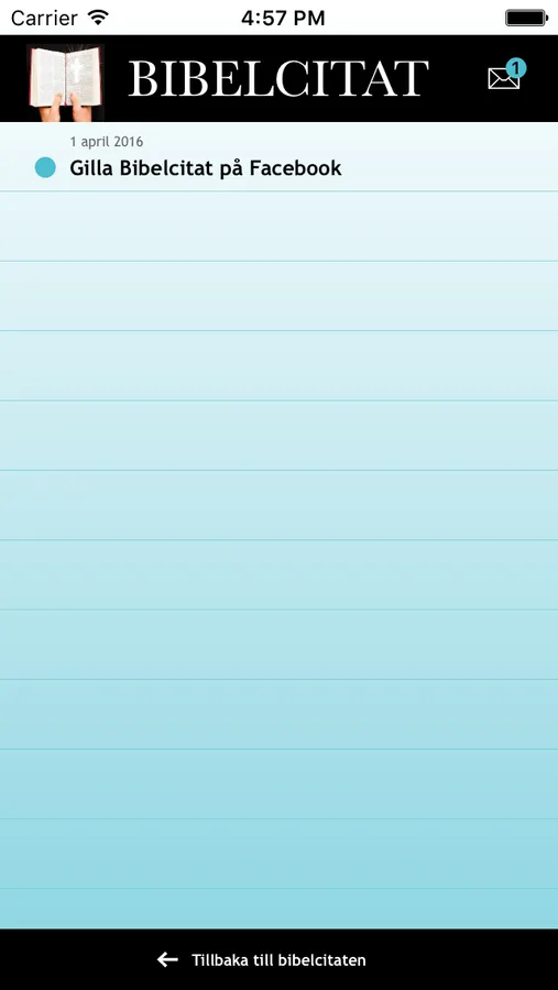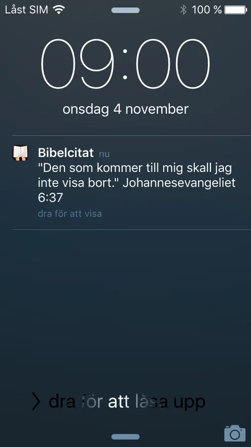 Den här appen gör att du får bibelcitat direkt i din iPhone. Bibelcitaten kommer som push-notiser (meddelande på skärmen i din iPhone) tre till sju gånger i veckan. Klickar du på push-notisen kommer du till själva appen.