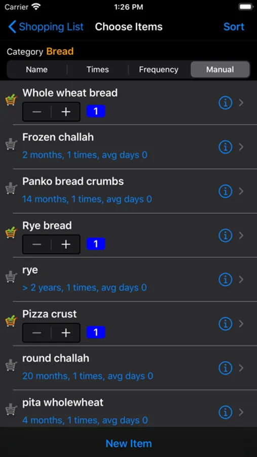 AccuShop remembers when you last purchased an item and you can specify approximately how often you purchase that item - Always, every 2 weeks, 3 weeks, etc. AccuShop can then, if you wish, start your new shopping list off with the most likely items you will need to purchase (like Milk or Bread).