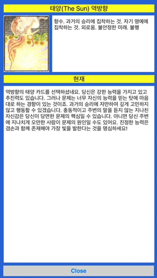 이 어플인 타로 이야기에서는 과거, 현재, 미래, 주변 상황 및 문제점을 보여줍니다.