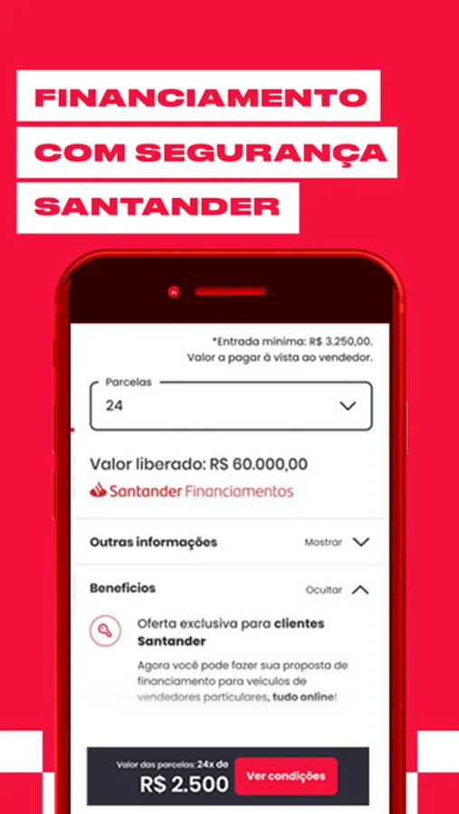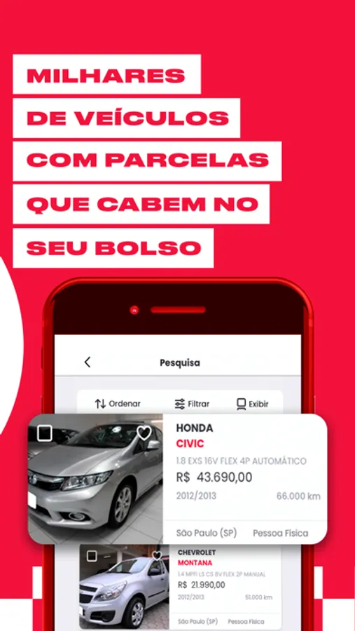 Pensando em comprar carro e moto, mas precisa de um financiamento de veículos? Escolha seu veículo e faça a simulação diretamente no anúncio do app. Envie seus dados e veja as condições disponíveis!