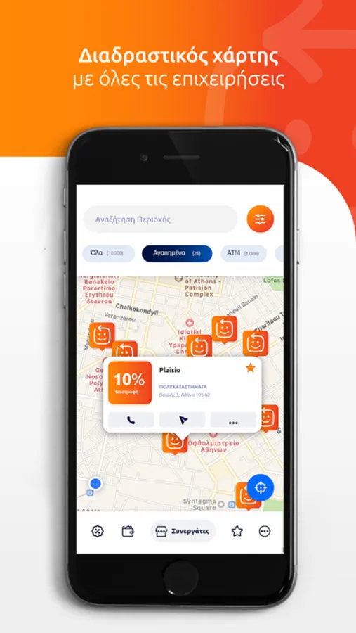 - Εύκολη αναζήτηση των συνεργαζόμενων επιχειρήσεων που βρίσκονται κοντά σας. Εάν έχετε ενεργοποιήσει την υπηρεσία GPS στο κινητό σας, στον χάρτη βλέπετε τον πιο σύντομο δρόμο για να φτάσετε εκεί.