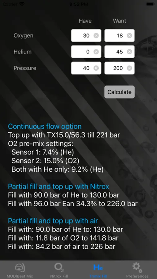 GasBlender supports Best mix and MOD for both Nitrox and Trimix and continous blending Nitrox and Trimix.