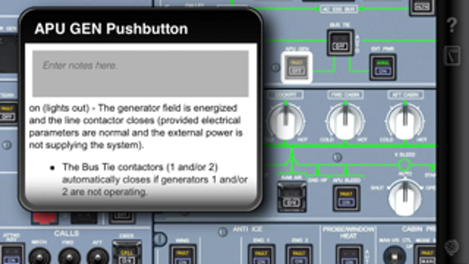 The Aerosim Checkride A320 for iPad, iPhone and iPod touch provides pilots with a self-study tool to help prepare for the oral exam and checkride through an educational cockpit experience. Checkride provides cockpit panel information ensuring accuracy and clear functional descriptions of each switch, pushbutton, and light/annunciator.