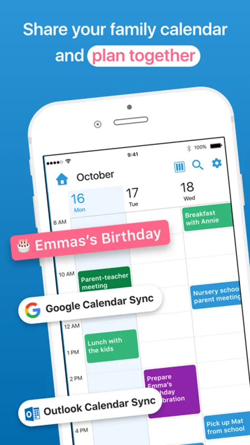 • Use the color-coded calendar to view an individual's schedule, or the whole family at once