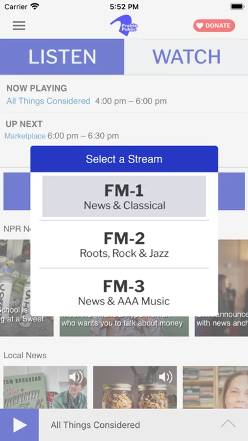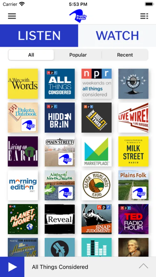 • Access public radio programs from multiple content providers (NPR, PBS and Prairie Public) easily and quickly.