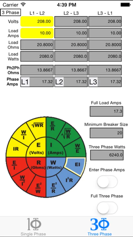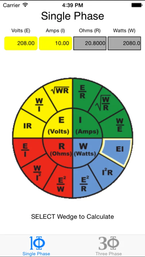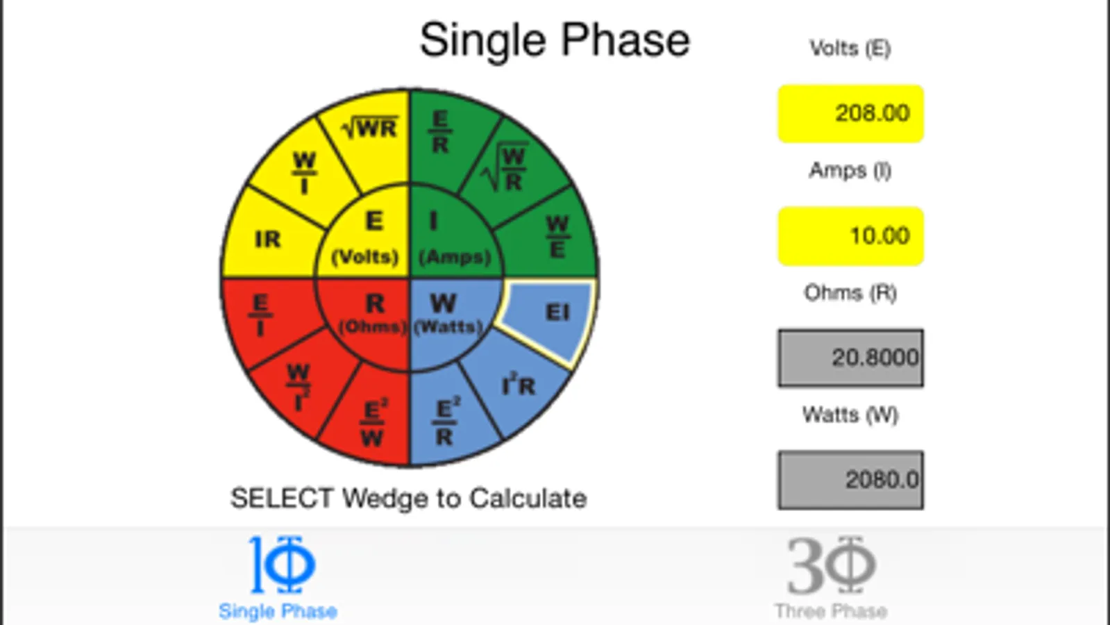 Calculates OHM's Law for Single and Three Phase Applications. This app uses proper vector calculations to accurately calculate BOTH balanced and unbalanced Three Phase loads. Calculate Watts, Volts, Amps or Ohms easily and quickly. Back calculate Load resistance from voltage and Phase Amps. Just pick a wedge from the OHM's law circle and go! NOW WITH WIDGET SUPPORT!