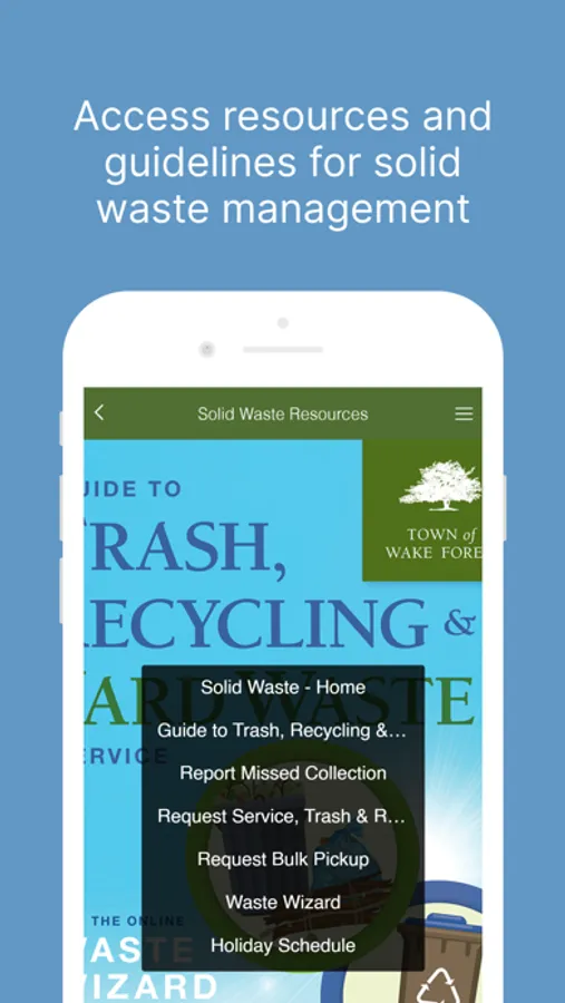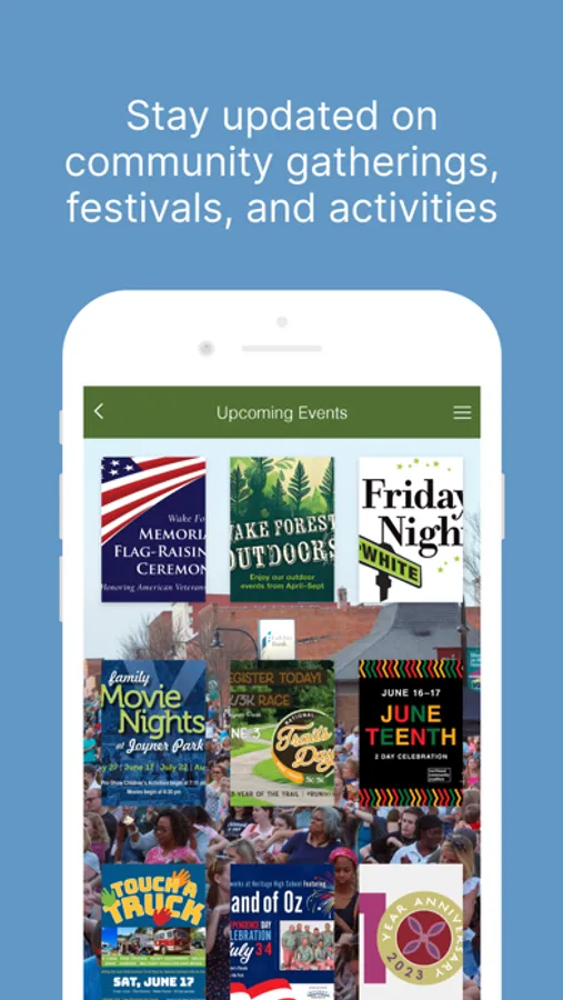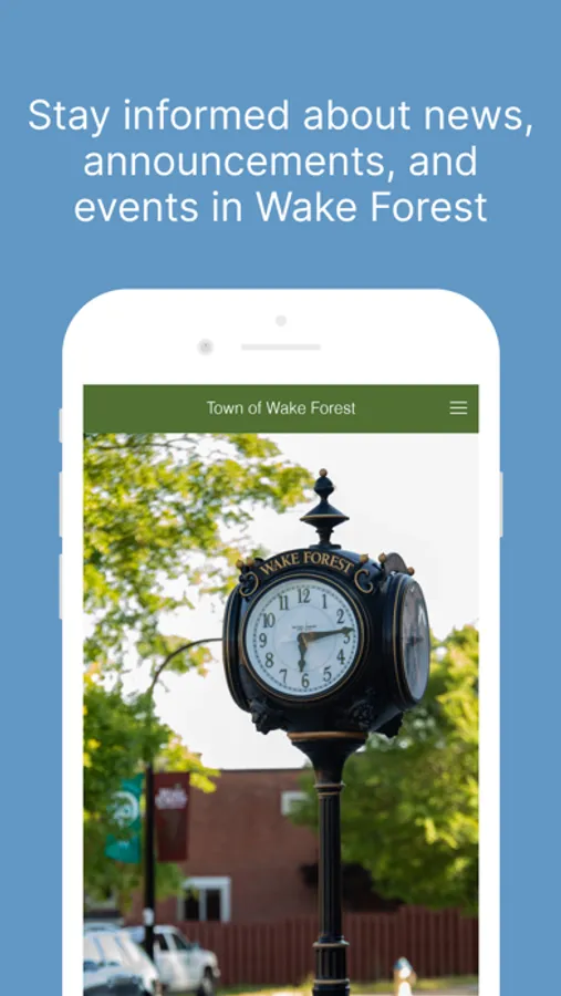 The app provides information about Town programs, services, and events. Intended for Wake Forest residents and visitors, the app also allows users to receive push notifications about time-sensitive events and activities. The app is free.