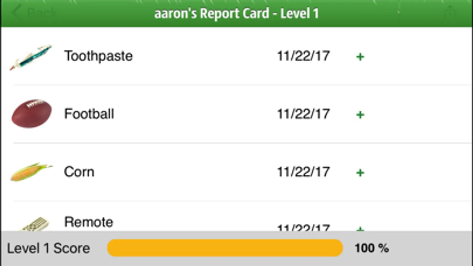 Levels: The App advances from the basic building blocks of language – simple labeling – all the way through shared features across categories. The Levels presented in incremental difficulty are: Level 1- Labels; Level 2 – Categories; Level 3 – Function; Level 4 – Feature; Level 5 - Randomized Feature, Function, Category; Level 6: Shared Featured, Function, Category.