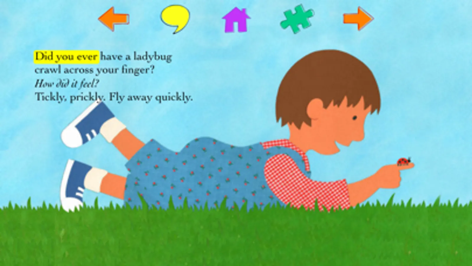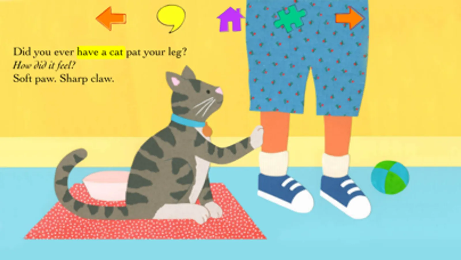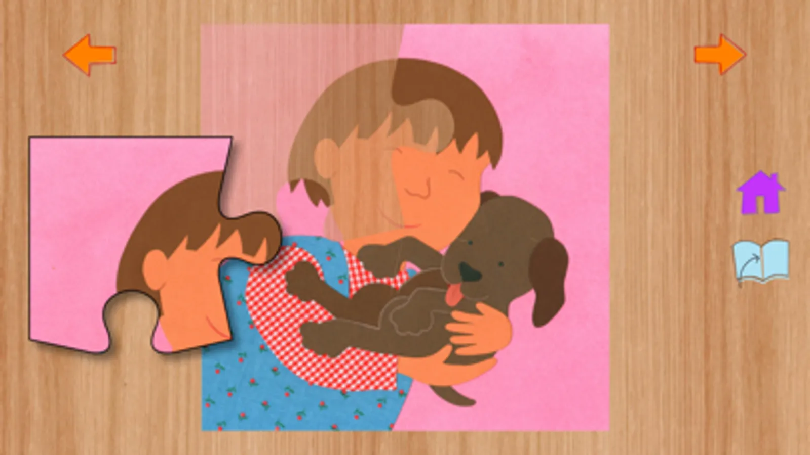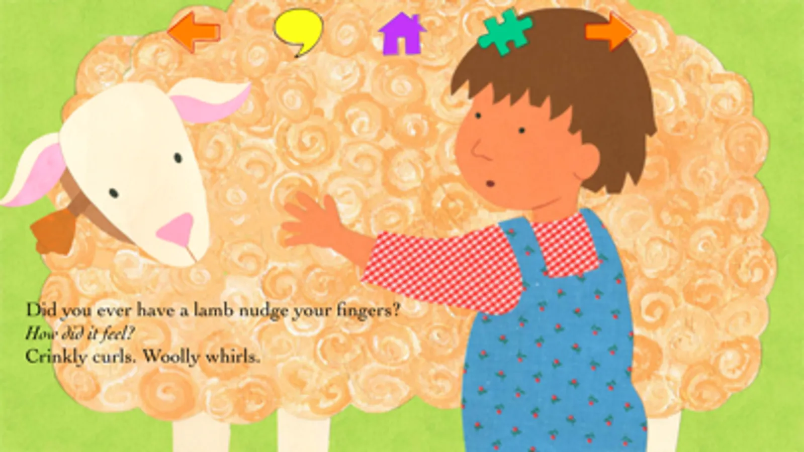 Every story page has animals in motion, such as a flapping moth, wiggly puppy, or snorting horse. Touching the animal restarts the motion. Tapping the puzzle piece, children can solve 4-piece jigsaw puzzles based on the current page. Pages can be read by the author with word highlighting, or an adult or older child can read the text to the child. Pages are turned by swiping across the page or by tapping orange arrows.