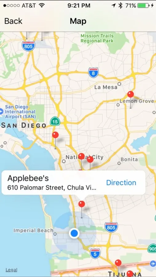 - App finds listed restaurants within 30 miles (50km) of your current location and directs you there via Apple Maps