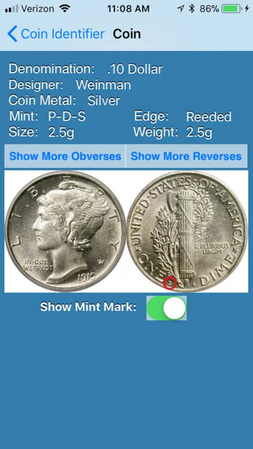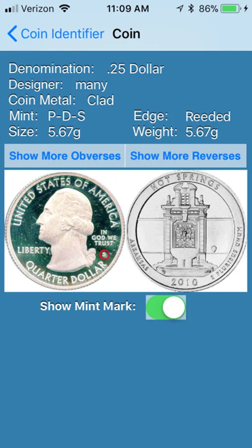 For some coins with multiple reverses and/or obverses, Show More Obverses and Reverses buttons will appear, which when clicked will present another view containing small images of all of the possible alternates.