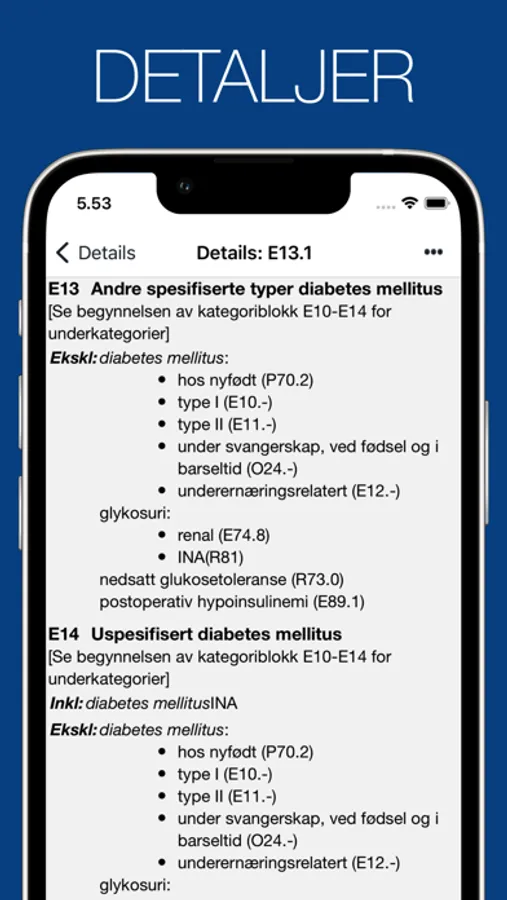 Bemærk venligst at der i denne udgave bruges de oprindelige WHO ICD-10 koder, hvor der ikke er et foranstillet "D" som i Sundhedsstyrelsens SKS-koder. De detaljerede beskrivelser (med inklusions- og eksklusionskriterier) af de enkelte koder er aktuelt kun tilgængeligt på norsk. Denne app benytter data der stilles til rådighed af de danske og norske sundhedsstyrelser (Medinfo.dk og Finnkode.kith.no) og er senest opdateret januar 2012.