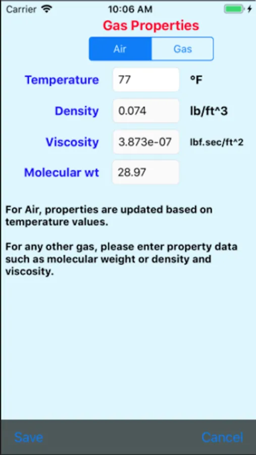 By default Air is used as gas medium and its properties are updated based on the input temperature. For gases other than air, the property data such as density, viscosity at given temperature for better accuracy.
