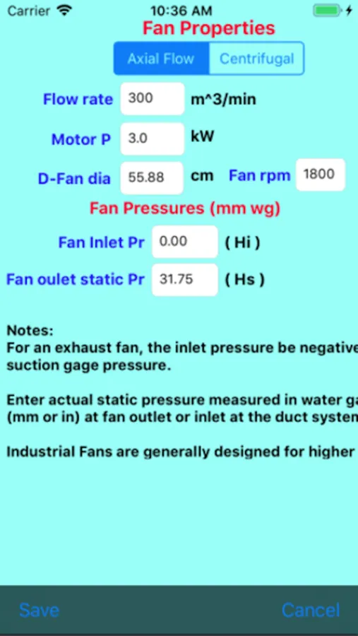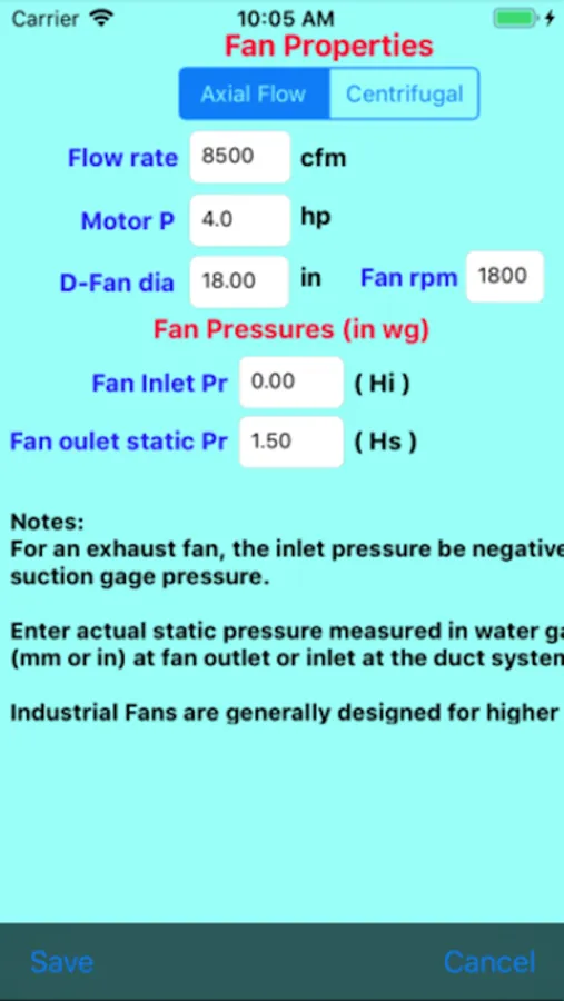 Fans are categorized based on the type of flow. The flow can be either axial or radial by centrifugal action based on type of application it is employed. In either case one can edit and enter key fan specification data as shown in the following screen shot.