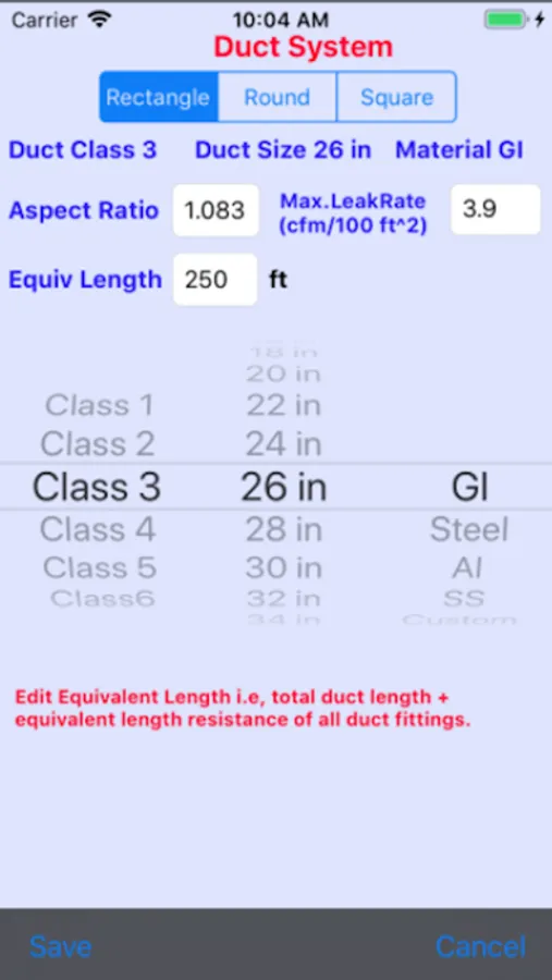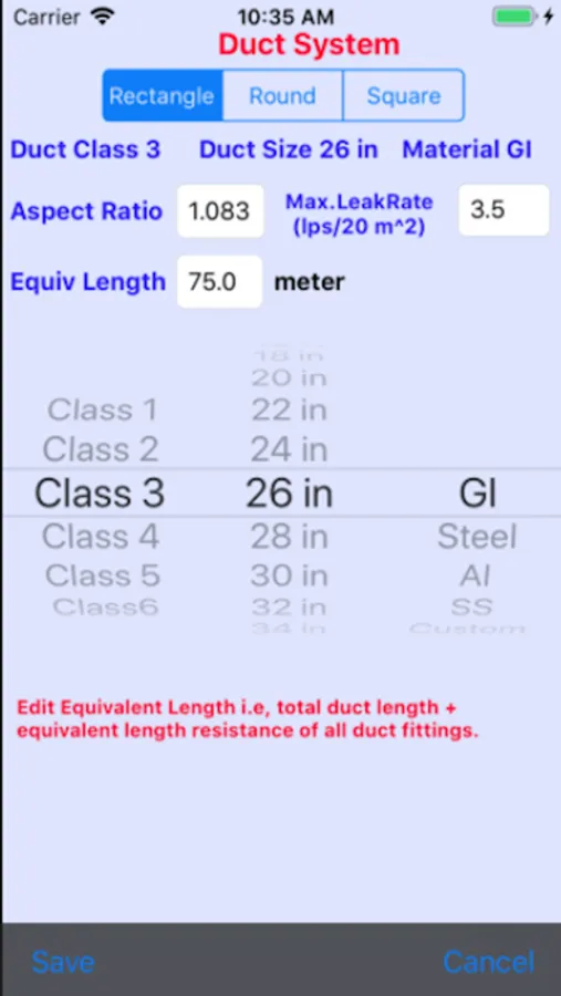 Users can choose any duct system based on cross section, class, size and material. Upon selection, app auto updates the duct leakage rates as per recommended standards. The total equivalent length data is used for evaluation of duct losses that includes resistance due to different duct fittings and terminal box etc.