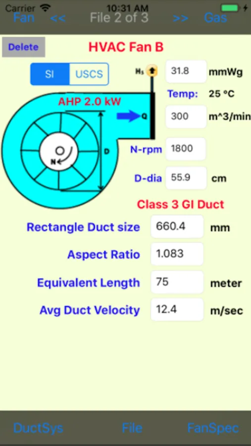Most manufacturers provide fan performance data in the form of fan curve (Q vs H). However, the operating point on this curve depends upon the total resistance offered by the duct system. This app helps application engineers to quickly evaluate different options available in selection and application of fans. One can chose either SI or USCS system of units for input and outputs as shown in the screen shots.