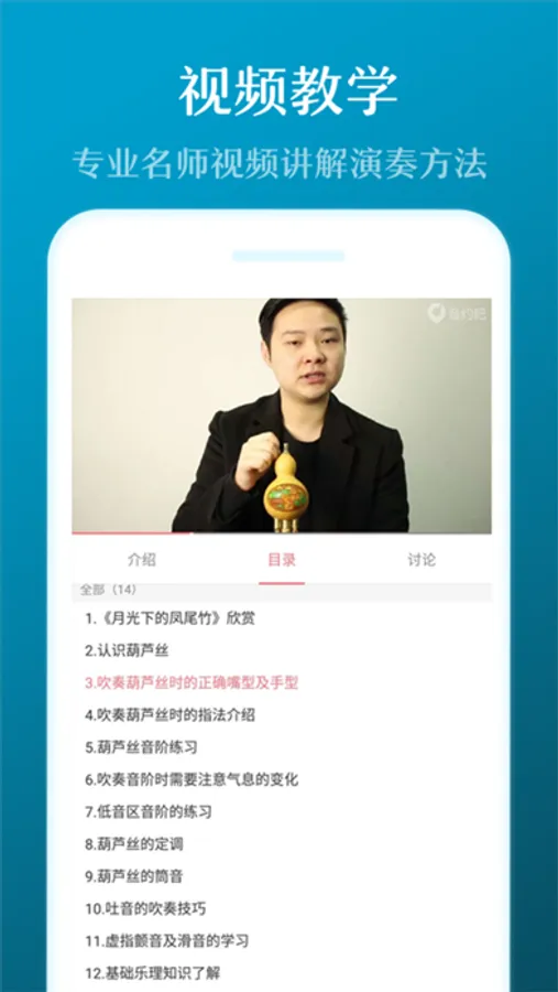 “葫芦丝”APP为您提供与专业老师教练的沟通平台,葫芦丝老师及时视频回答您的提问。“葫芦丝”APP为您提供广大音乐爱好者交流学习的平台,学音乐不再枯燥!