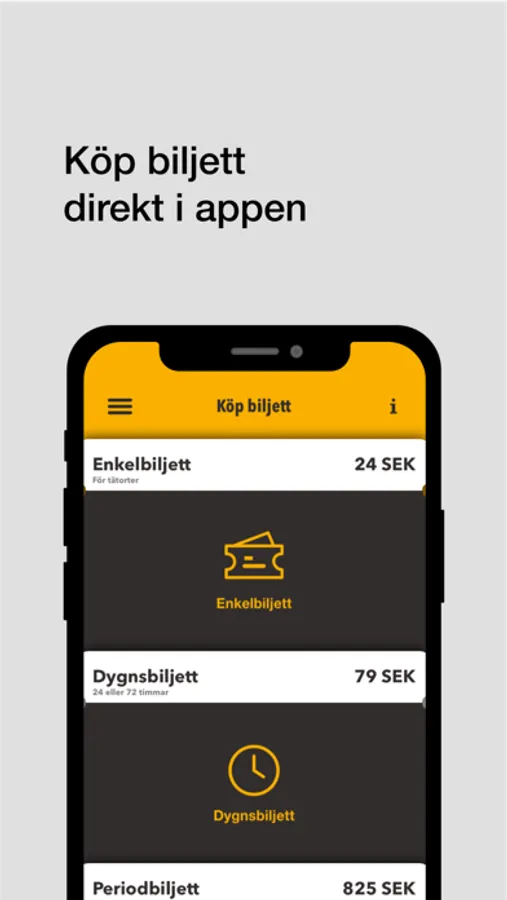 I appen kan du köpa mobilbiljett för korta och långa resor. Säker betalning görs med Swish, bankkort, månadsfaktura eller företagskonto.