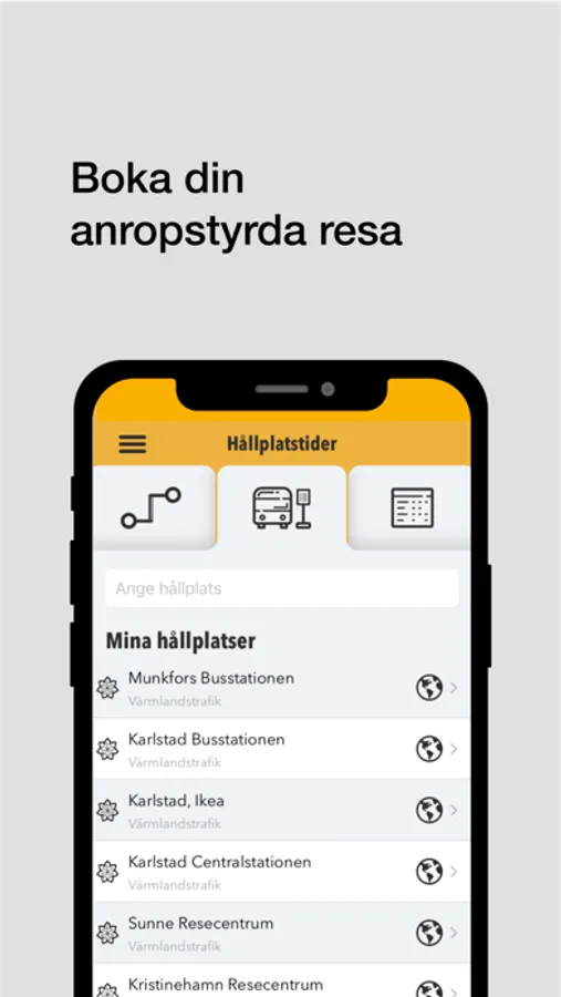 Hållplatstider visar information om avgående bussar från vald hållplats med avvikelser i realtid.