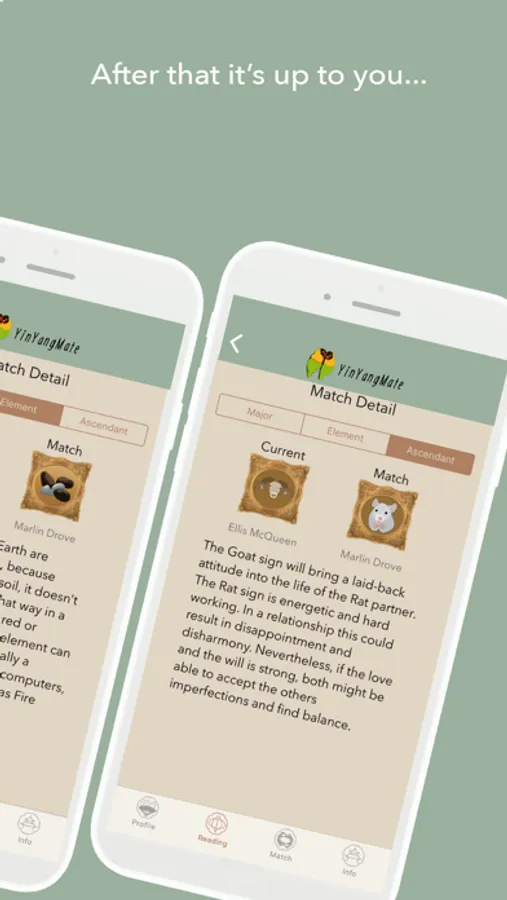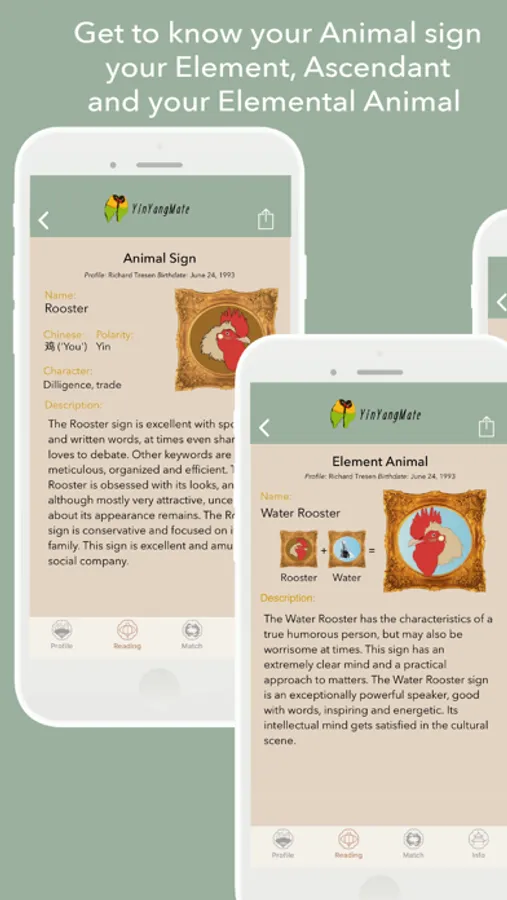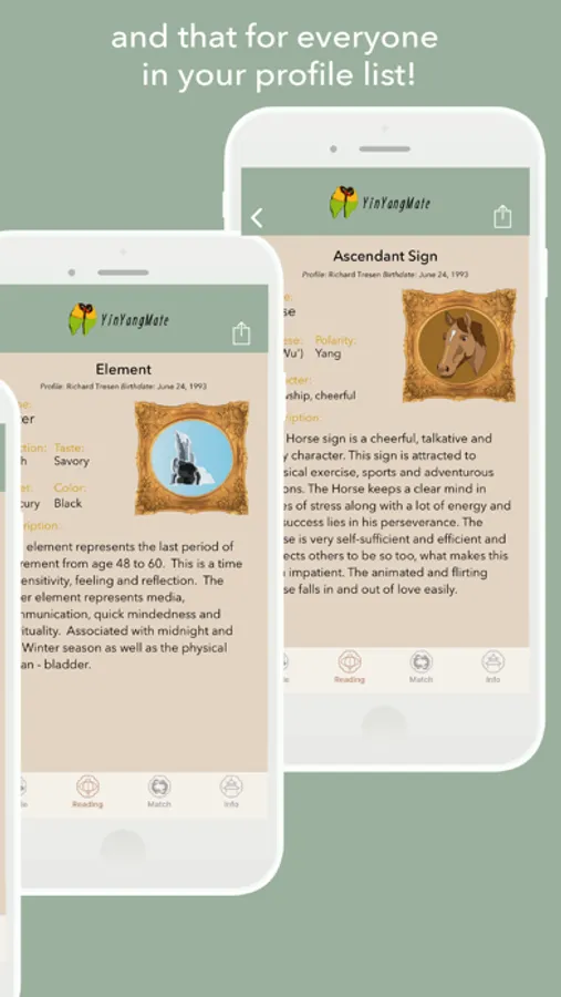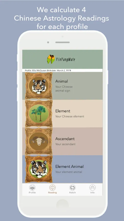 YinYangMate uses the knowledge of this fascinating world of Chinese Astrology and offers a great compatibility and matching app. Based on the date and time of birth of you and your partner, YinYangMate calculates a personal compatibility reading for all three influential signs. Do you want to share your main compatibility reading? Email or sms it to your loved one or friends.