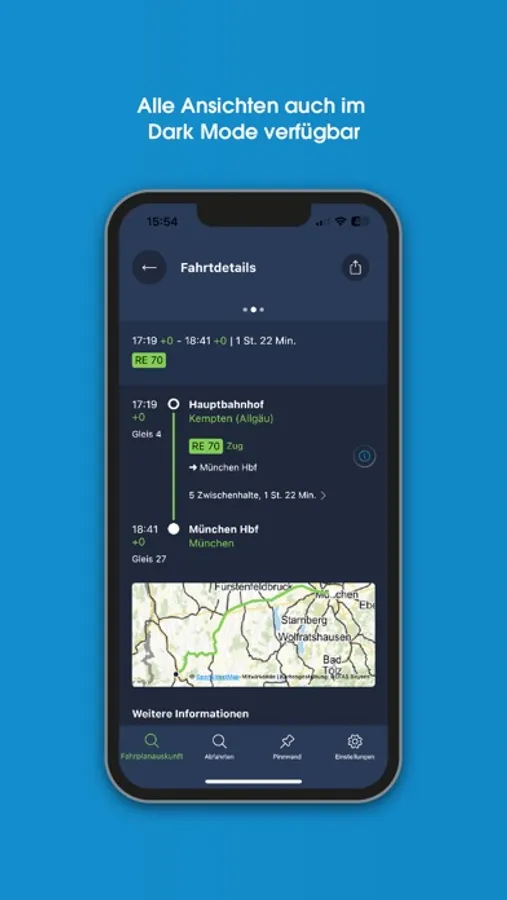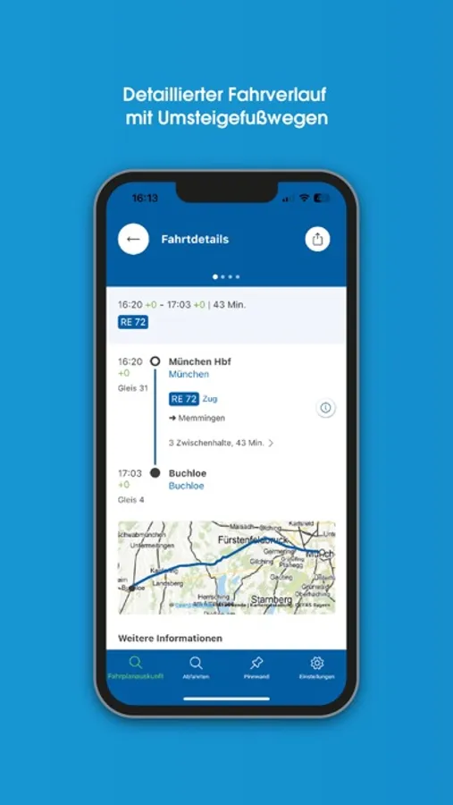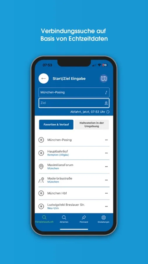 Fahrplanauskunft: MoBY liefert adressgenaue Tür-zu-Tür-Verbindungen mit Bahn, Bus und ergänzenden Mobilitätsangeboten wie Sharing- und On-Demand-Diensten. Die App kennt die über 40.000 bayerischen Bahn- und Bushaltestellen und informiert über Abfahrten und Ankünfte an der vom Nutzer ausgewählten Haltestelle oder in seiner Umgebung – in der Regel auf Basis von Echtzeitdaten, die potenzielle Ver-spätungen oder Ausfälle berücksichtigen. Über eine Karte lassen sich die aktuellen Positionen der meisten Verkehrsmittel live mitverfolgen. Häufig genutzte Verbindungen lassen sich als Favoriten speichern und mit einem Klick abrufen.