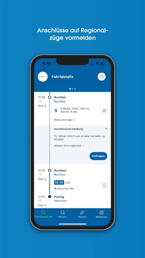 Anschlussvoranmeldung: Reisende können über MoBY bei Reiseverbindungen mit Regionalzügen An-schlusswünsche voranmelden. Für Fahrgäste genügt ein Klick in der App, um den Anschlusswunsch an-zustoßen. Wenige Minuten später erhalten sie eine Rückmeldung auf ihr Handy, ob der Zug am Umstei-gebahnhof warten kann.