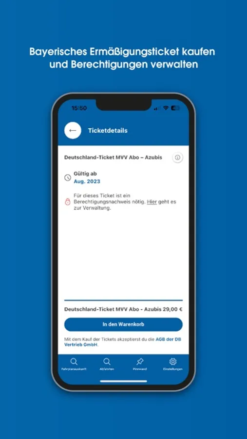 Tickets: MoBY-Nutzer können derzeit über die App das Deutschlandticket und das bayerische Ermäßi-gungsticket für Auszubildende, Studierende und Freiwilligendienstleistende buchen und bezahlen. Schritt für Schritt kommen viele weitere Ticketangebote hinzu.