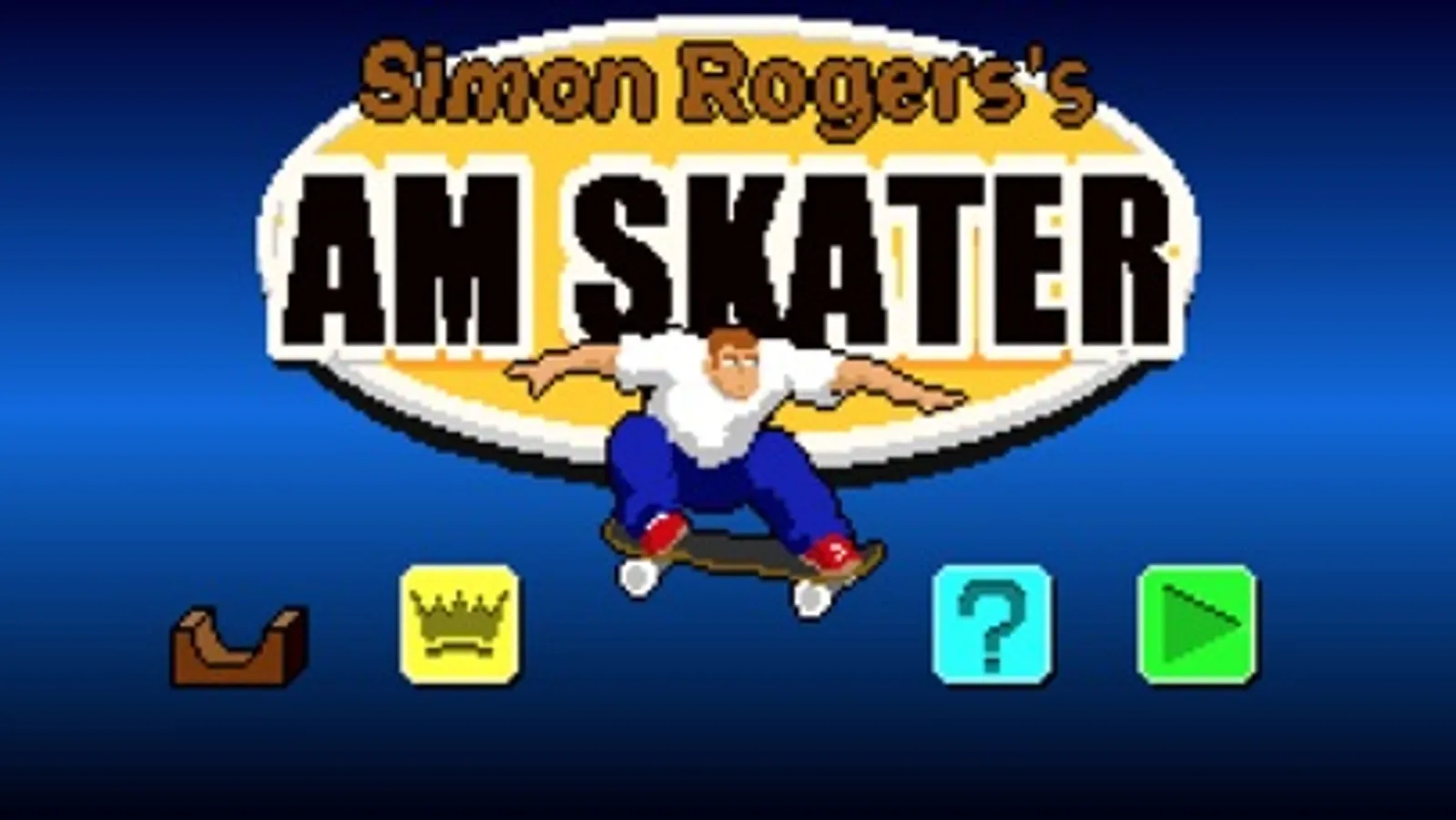 Simon Rogers's AM SKATER is a horizontal scroll type action game, where the player is a skateboarder who jumps over obstacles with that most essential of cool skater moves, the "Ollie".
