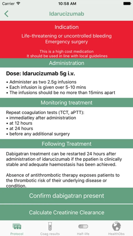 A common question with any anticoagulant is how long should treatment be stopped before surgery? The Dabigatran App calculates a safe interval between stopping treatment and surgery by including renal function and the time since the last dose. It also offers advice for treatment prior to emergency surgery if the surgery cannot be delayed.
