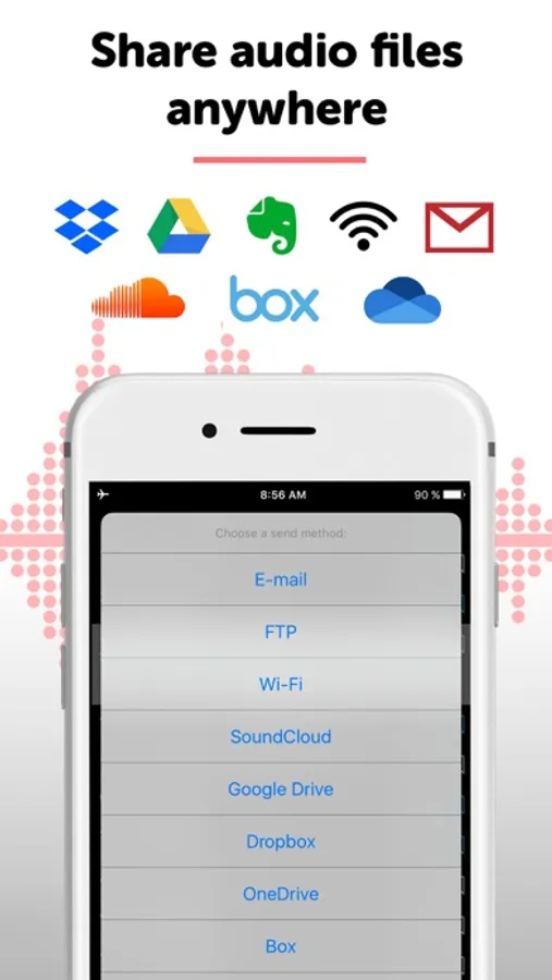 • Uploading recordings to Dropbox, SoundCloud, GoogleDrive, OneDrive, SharePoint, YouTube, Box, Evernote, FTP/HTTP/WebDAV servers
