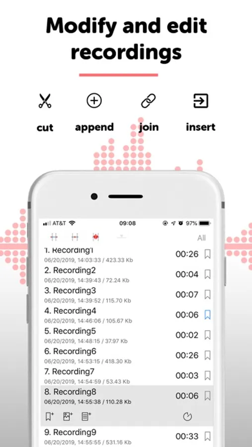 • Edit options: Append, Trim, Cut, Overwrite, Insert, combine recordings