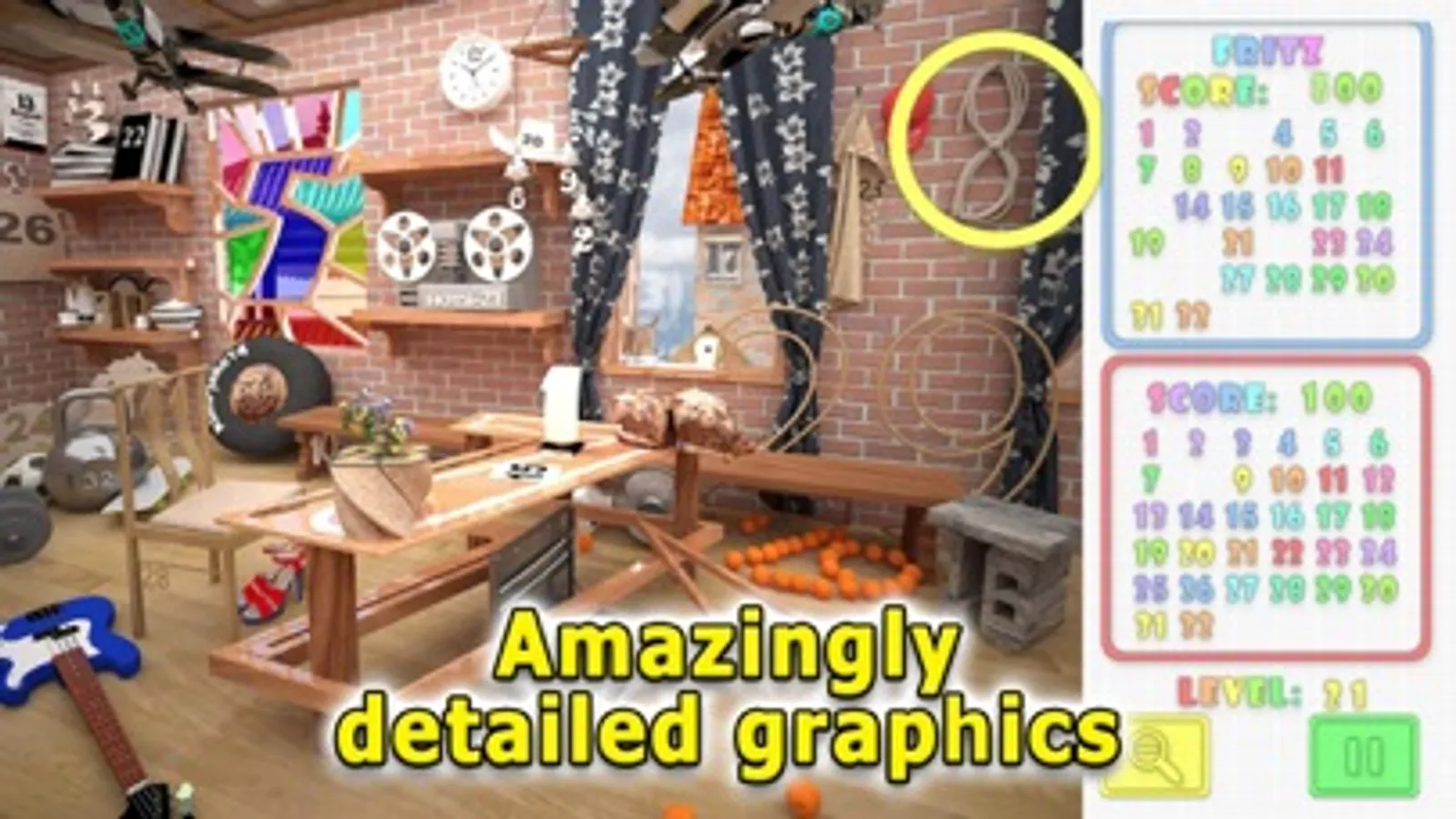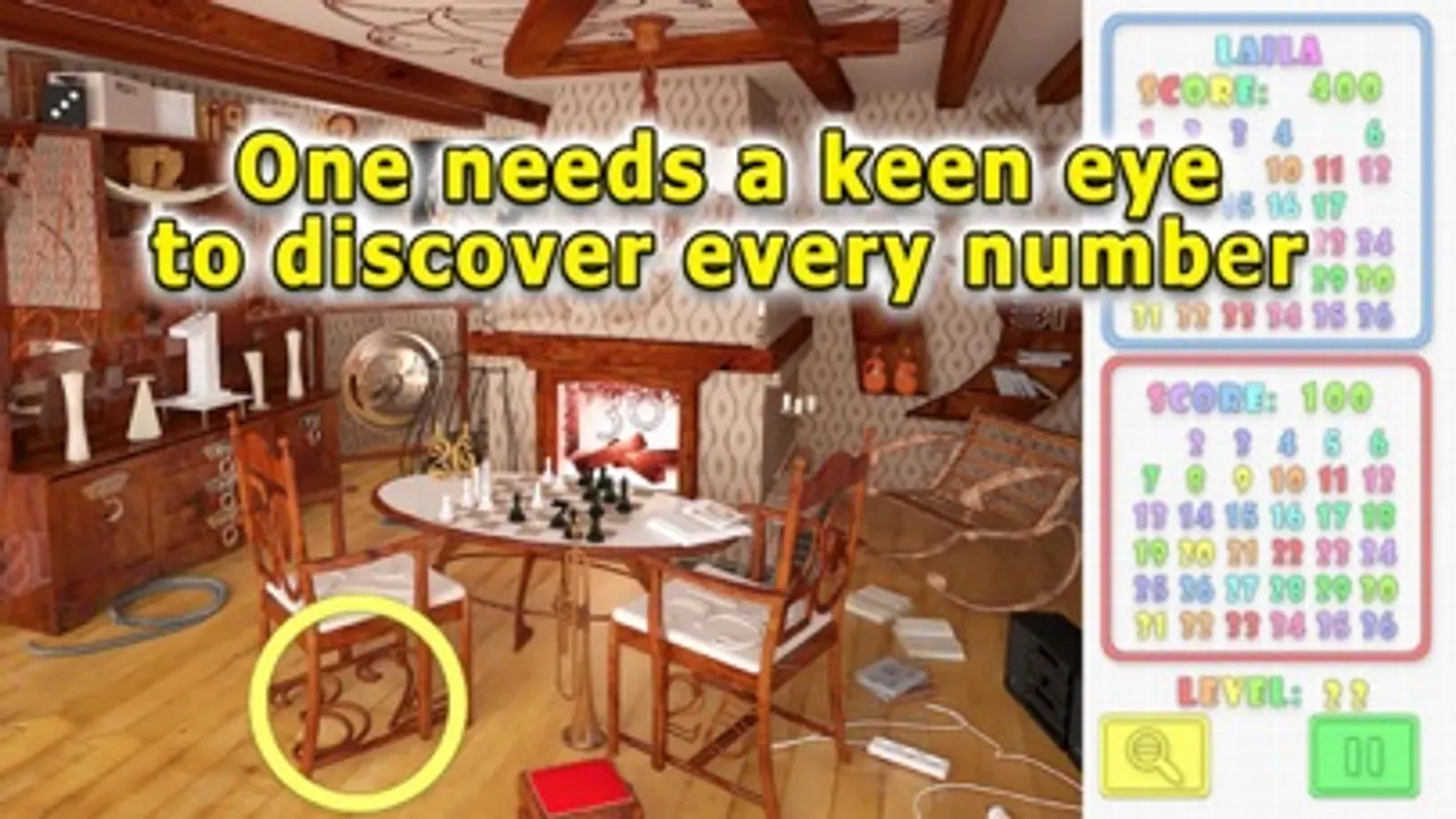 Investigate all levels without limitations and play as much as you want. Your task is to find hidden numbers among a big quantity of other objects. Double tap on the screen zooms in/out the image. Exploring the picture in the magnifier mode is easy as you drag the image aside by the touch of your fingertips. Improve your detective skills to compete with others online and take the best place among other seek-and-find fans in the global leader board.