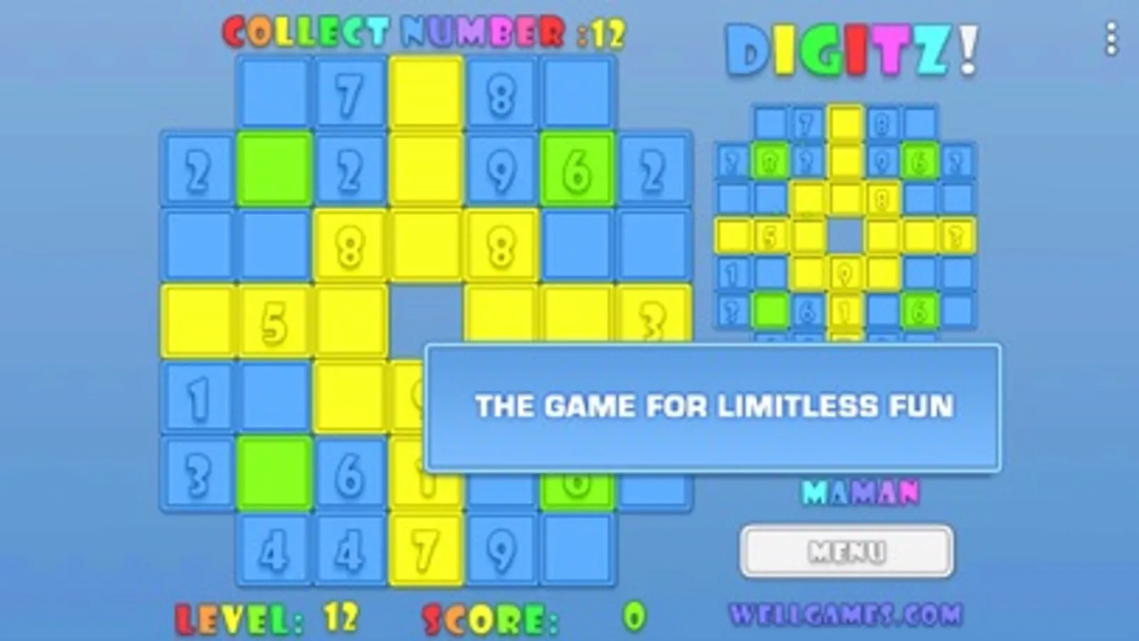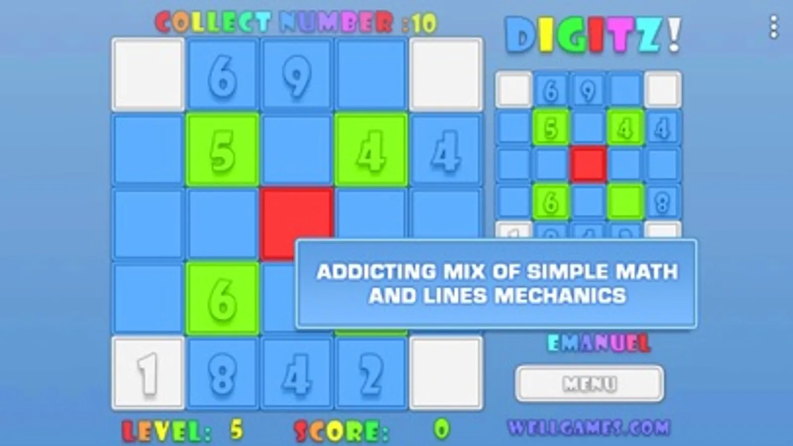 Enjoy a fun Math game offline. Match numbers so that their sum in the adjacent tiles makes up ten. Try and change the tiles color to white in order to pass a puzzle board. New digits appear randomly on the board, so mind your every move in the casual game to avoid cluttering the board. The target sum changes as you progress, and the puzzle board get more and more challenging to complete. However, if you are really up to challenge and would like put your Math skills to test. Play online to compete in the 2-player game mode an get bonus score for every brainteaser solved faster than your opponent. This simple Math game is also a good game for seniors as a means to train your brain and improve memory!