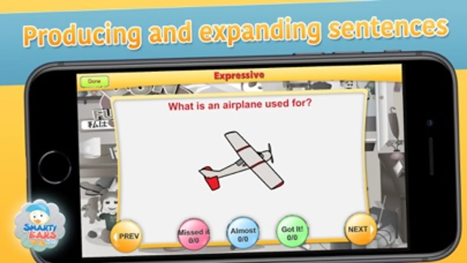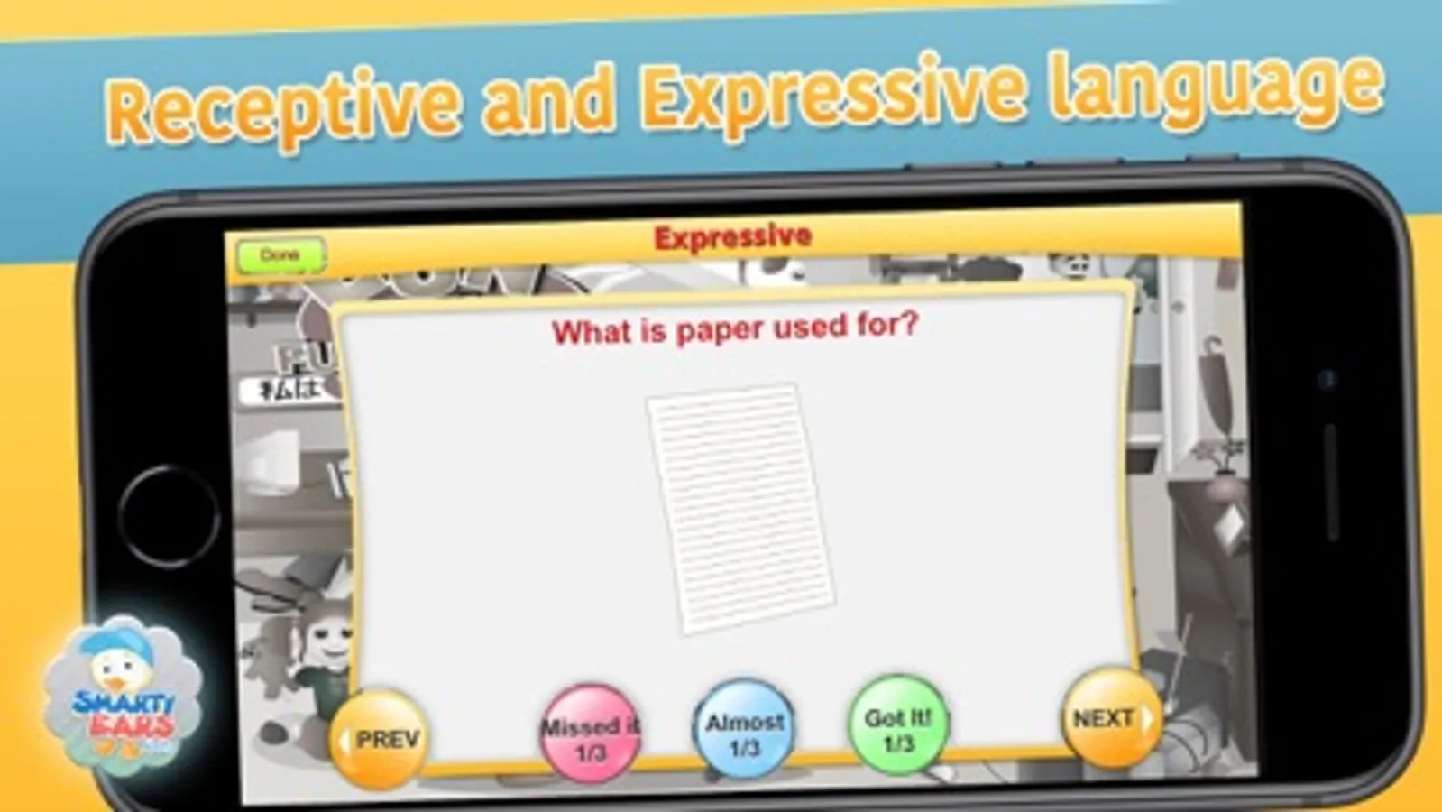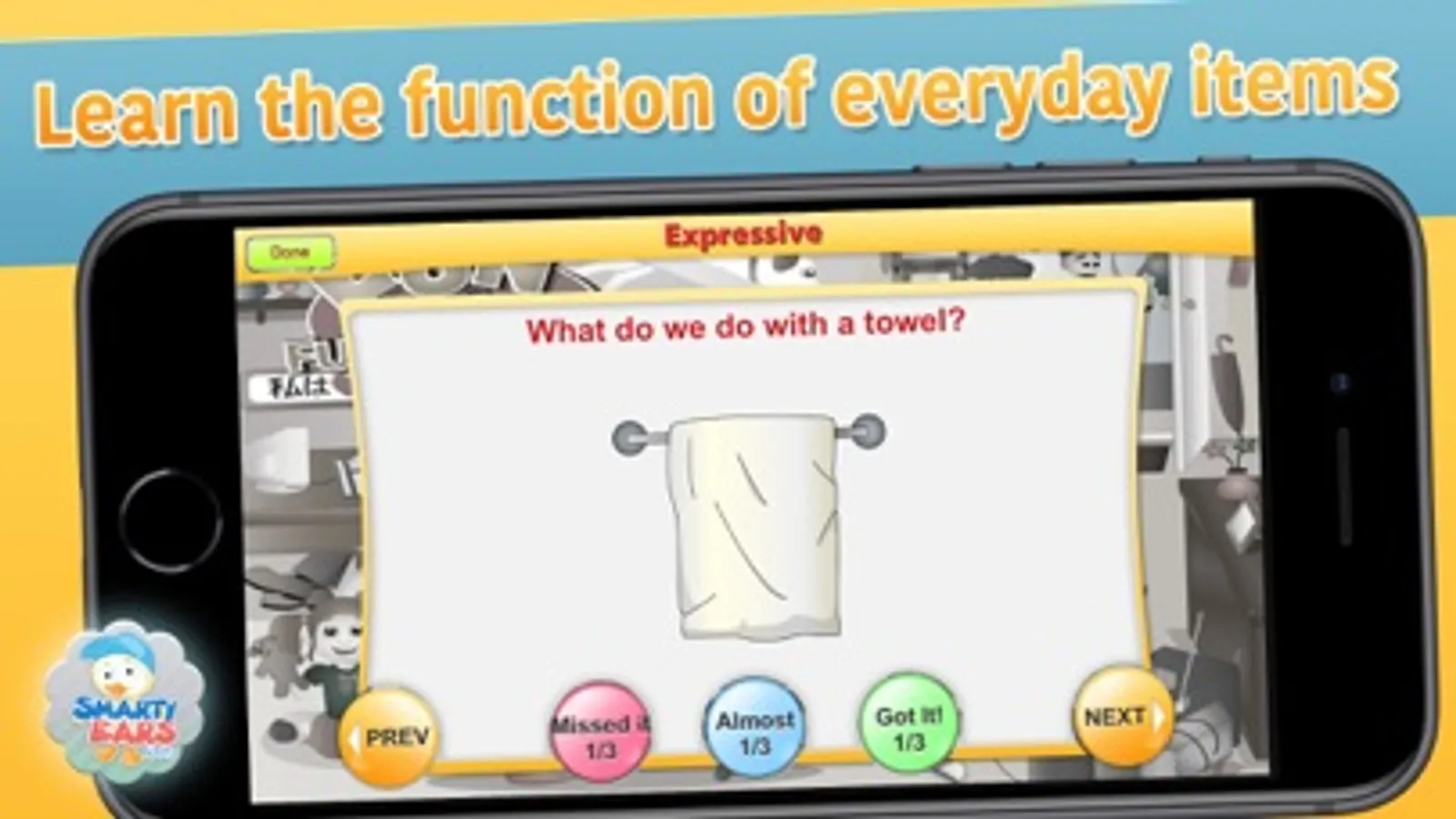 -Expressive Activity in which students verbally describe the function of items (e.g. “What do you do with a broom?), so that SLPs, parents or others can score their response as “Missed it!” “Almost” or “Got it!” within the application.