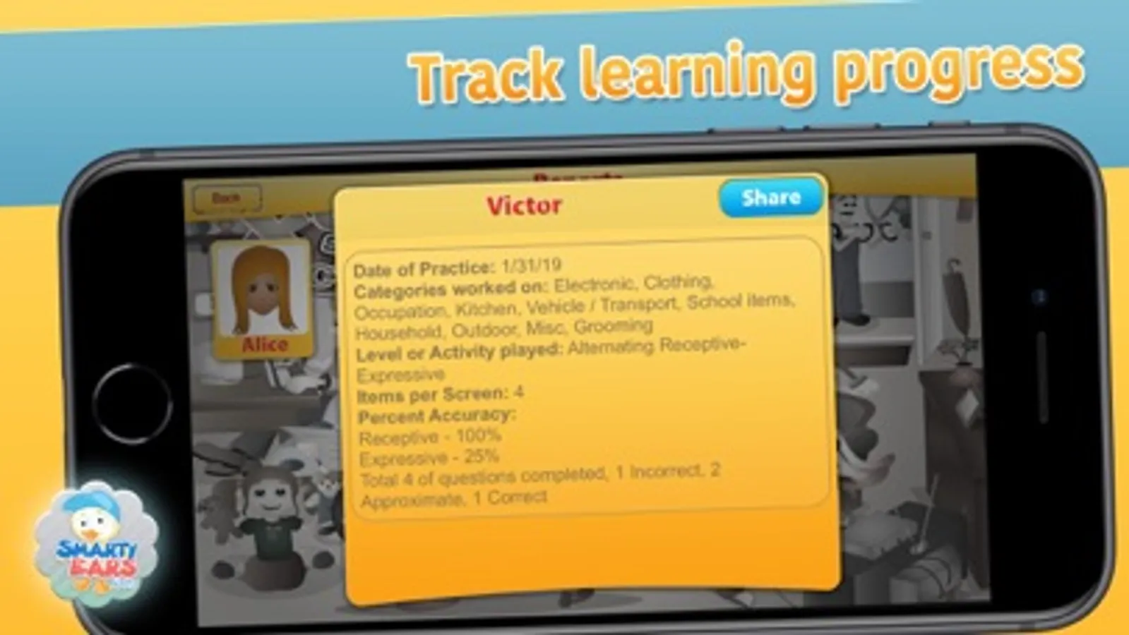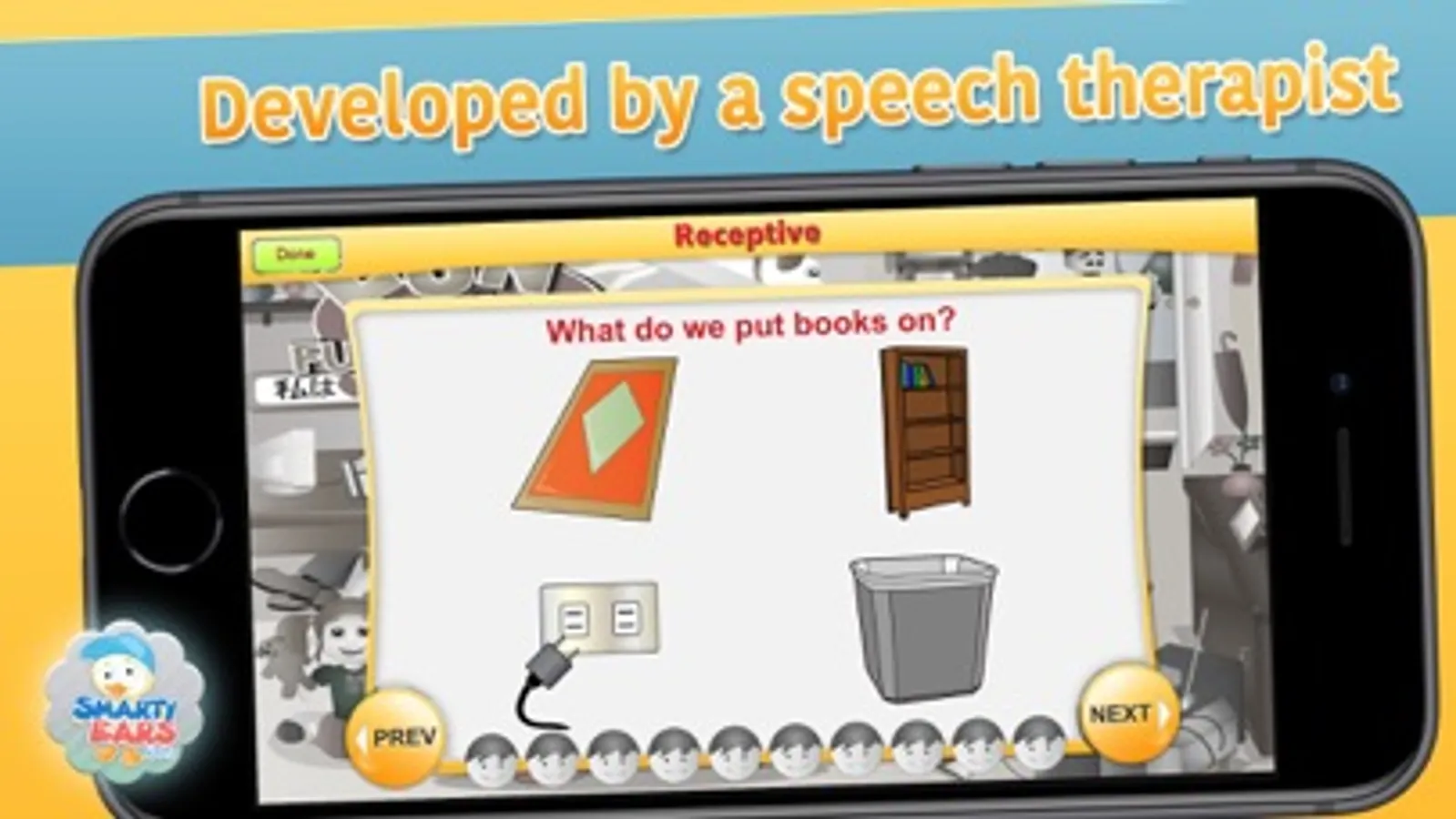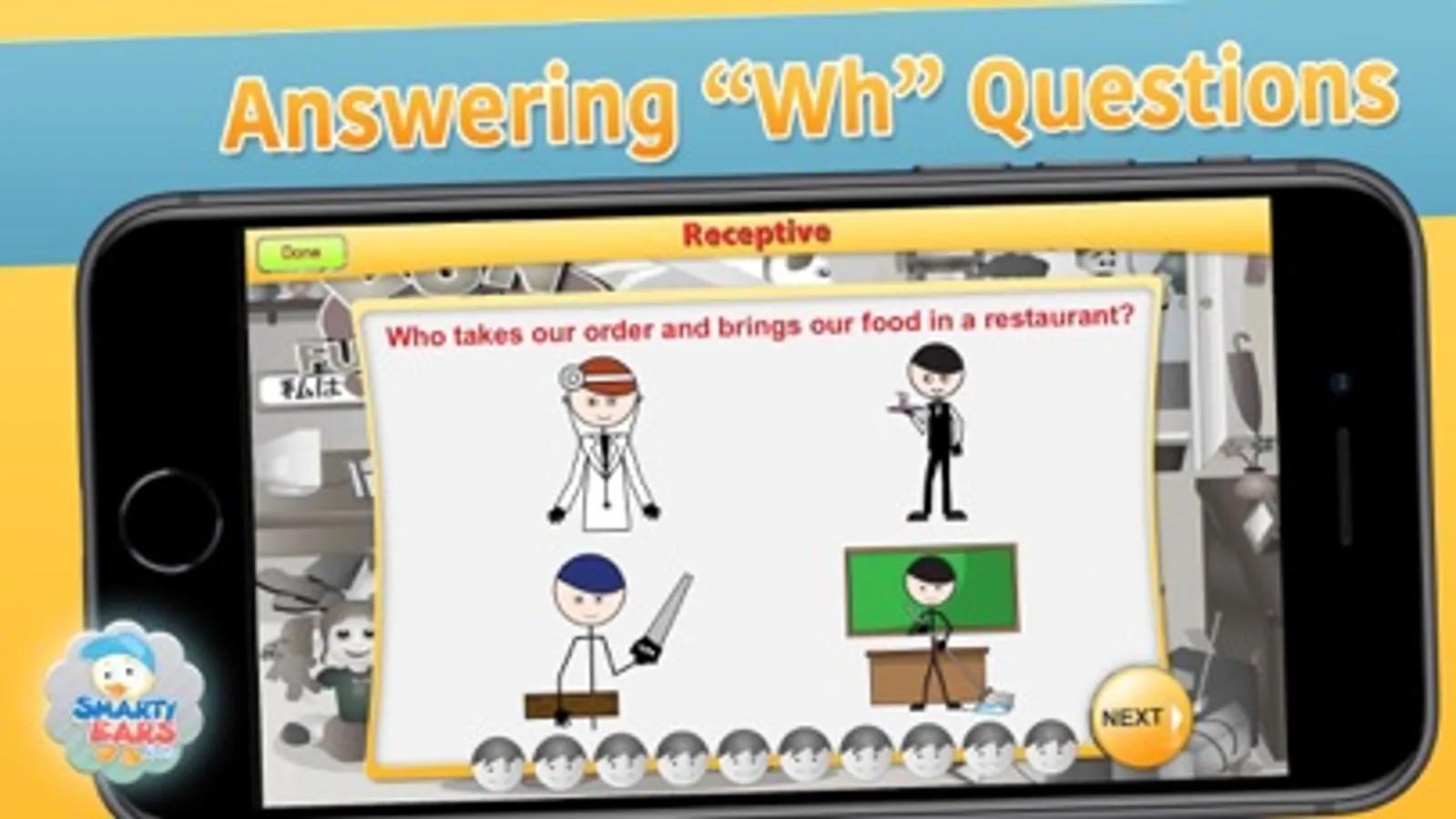 -Expressive Activity in which students verbally describe the function of items (e.g. “What do you do with a broom?), so that SLPs, parents or others can score their response as “Missed it!” “Almost” or “Got it!” within the application.