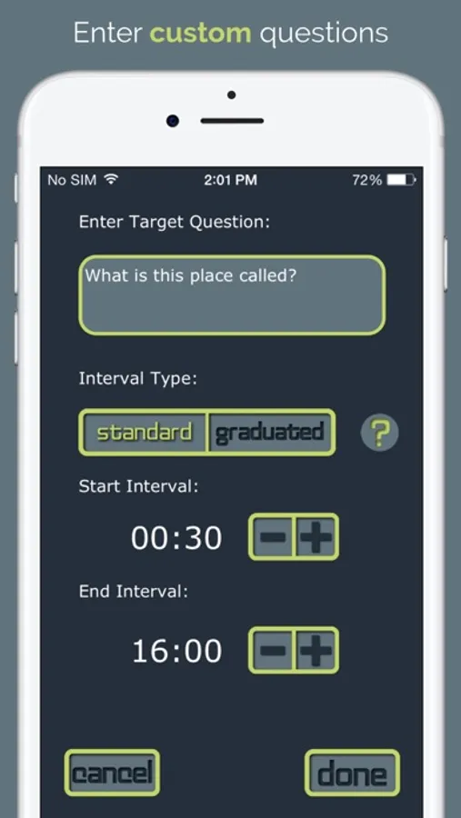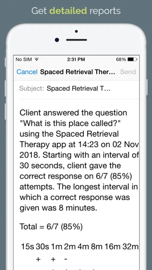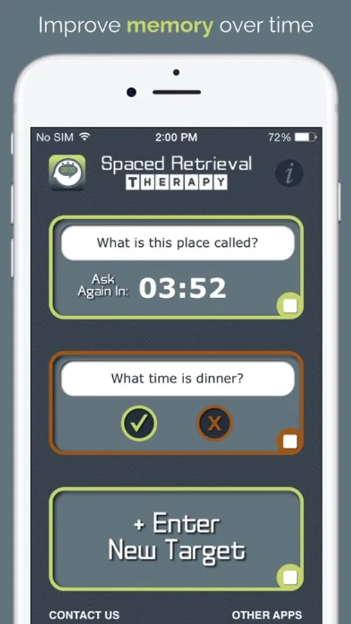 This Spaced Retrieval Therapy app uses the scientifically-proven method of spaced retrieval training to help people with dementia or other memory impairments to recall important information. Recalling an answer over multiplying intervals of time, such as 1 minute, 2 minutes, 8 minutes, and so on, helps to cement the information in memory.