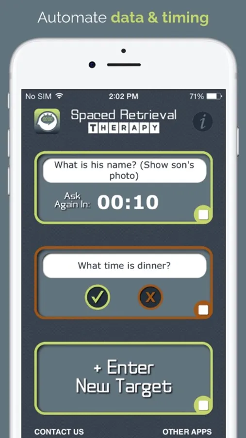 Please note: This app is a timer and tracks data. Targets should be individually selected for the memory-impaired person to be relevant and meaningful. This app is not intended to be used alone by the memory-impaired person, but as a therapy tool by a clinician or family member trained in this technique.