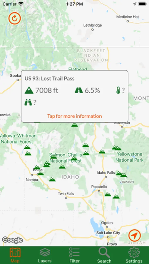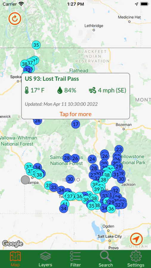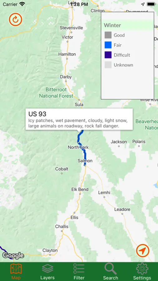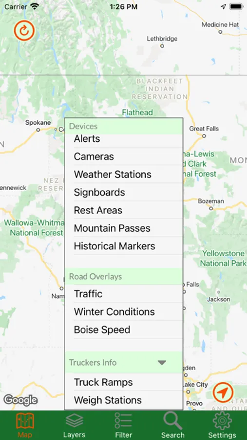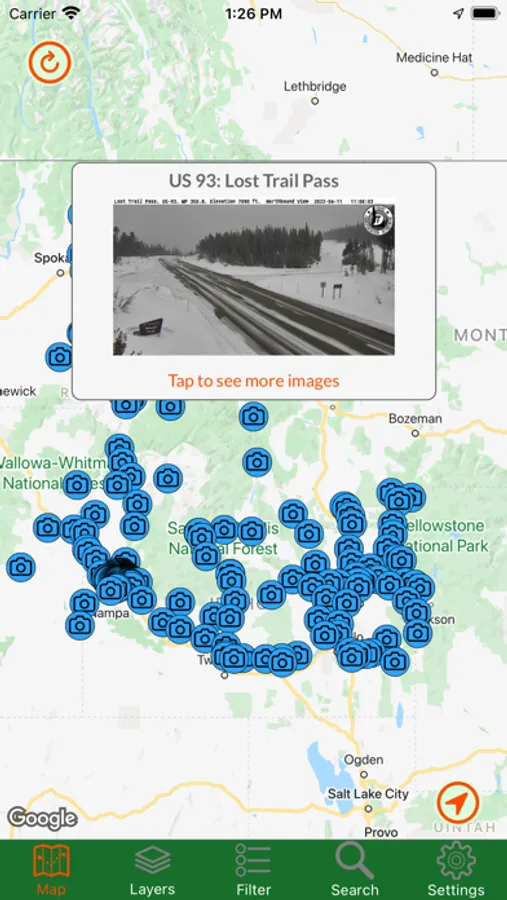 Idaho Traveler shows you the current conditions of major roads and highways throughout Idaho. You can view traffic cameras, read alerts about road closures, get stats from weather stations, and read roadside signboard messages. You can also view road overlays that tell you the current surface conditions.
