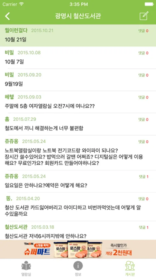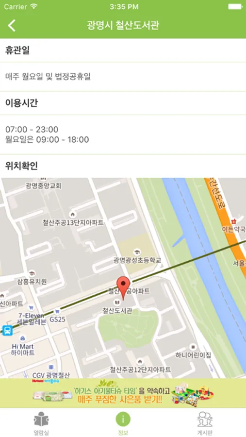 * 도서관 정보 (휴관일, 이용 시간, 위치)