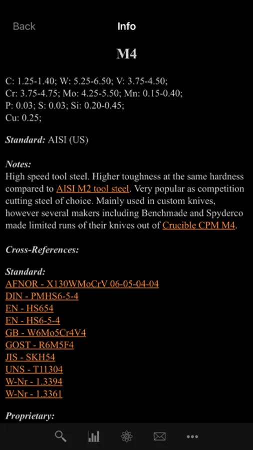 Knife Steel Composition and name cross-reference database. Includes popular, high end and exotic alloys used in knife blades. Over 6500 alloy names, over 1000 compositions. Alloy names for 21 different international standards, proprietary names and their equivalents. Easy alloy composition comparison with bar graph in 3 modes: mass percentage, molar masses and atomic count per 1000 atoms.