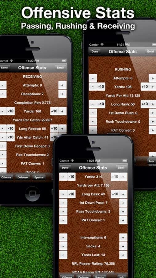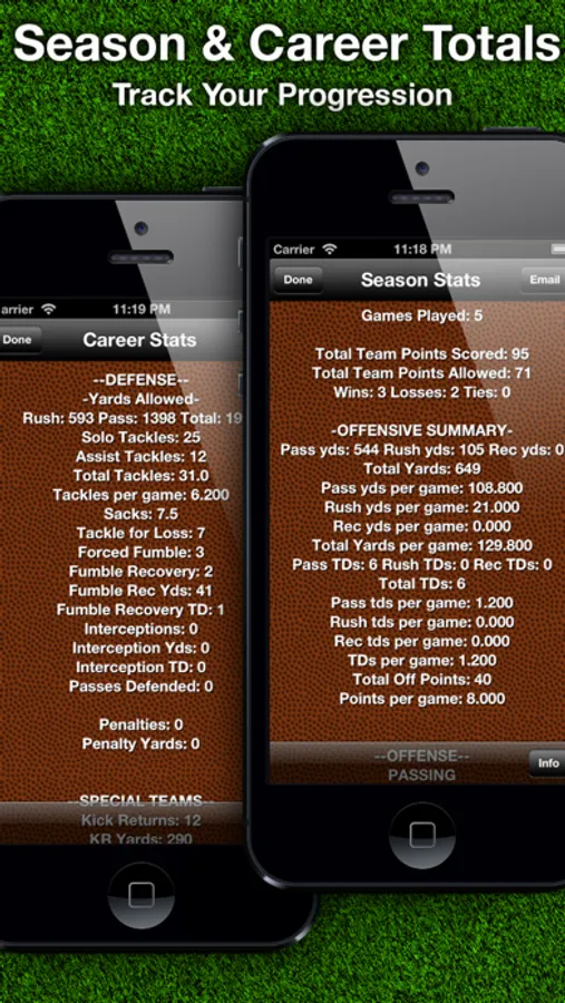 Created by a player for the player! Football Stats Tracker Touch is far and away the best application of its kind that allows you to keep track of your personal stats for Tackle Football, Flag Football and Pop Warner/Pee Wee Football all on your iPhone, iPod Touch and iPad.