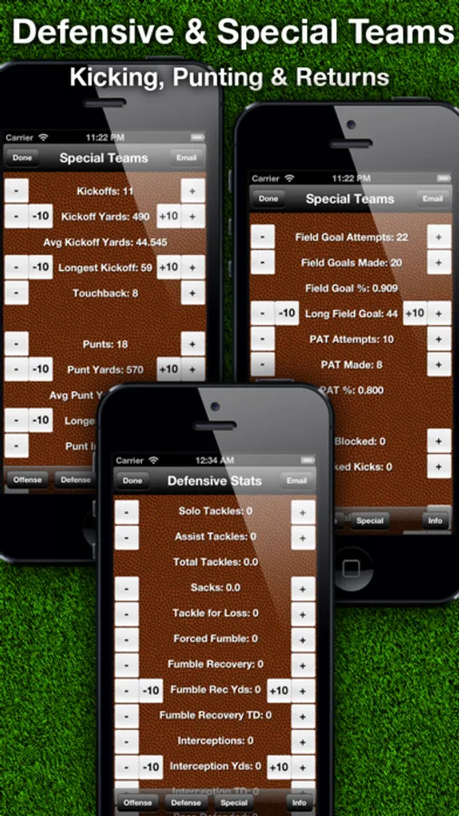 Football Stats Tracker Touch is the most comprehensive and complete stat keeper in the entire App Store giving you the ability to track all offensive defensive and special teams stats with ease. While other stat trackers only let you keep track of games, Football Stats Tracker Touch allows you to keep track of games, seasons and even careers! You can even follow your favorite pro players during their games and keep stats like the pros!