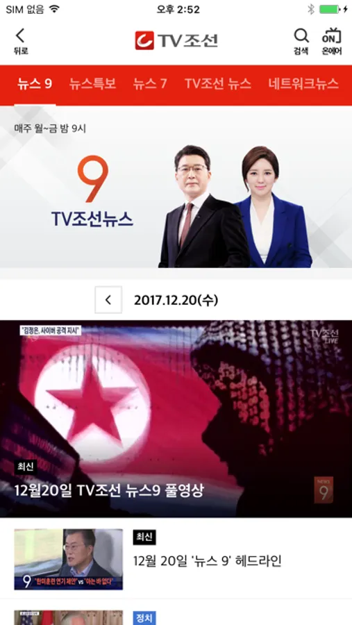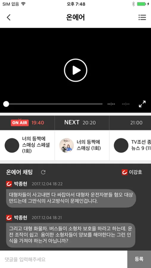 2. 온에어: TV조선에서 방영중인 프로그램을 실시간으로 플레이 하실 수 있으며, 온에어 채팅을 통해 실시간으로 의견을 남길 수 있습니다.